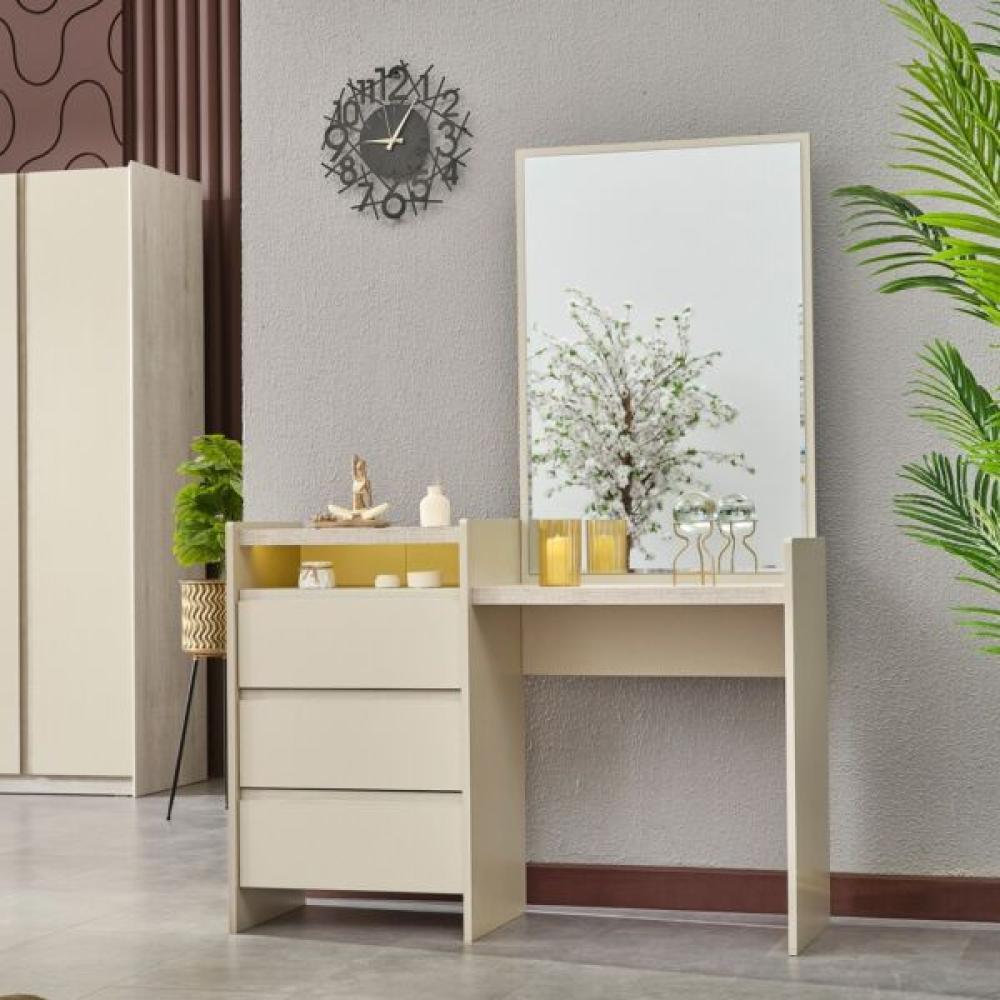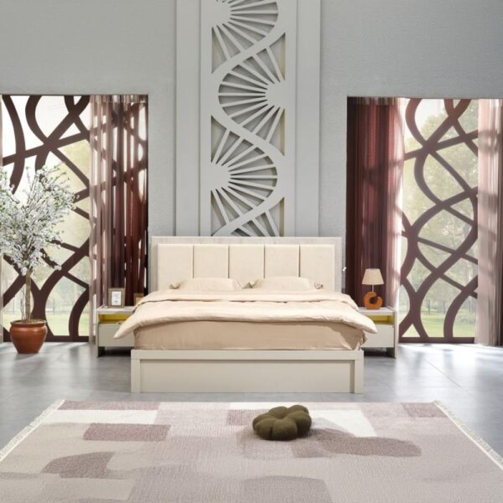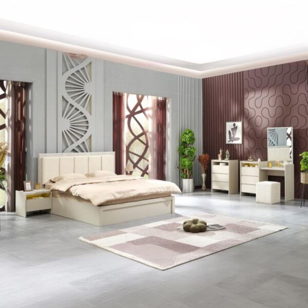 يتضمن الطقم: 1 × سرير كينج، 2 × طاولة سرير جانبية, 1 × طاولة تزيين، 1 × مرآة، 1 × مقعد.
