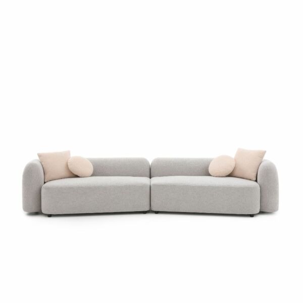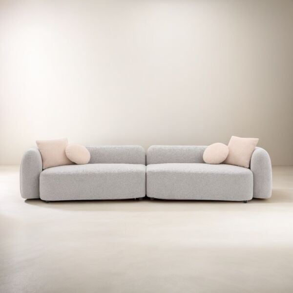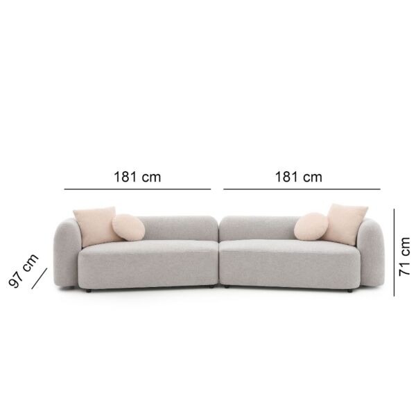 : أربع وسائد – 2 وسادة ديكور مربعة تعزز من جمالية الكنبة، و 2وسادة دائرية صغيرة في الوسط للدعم والديكور.